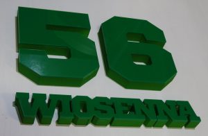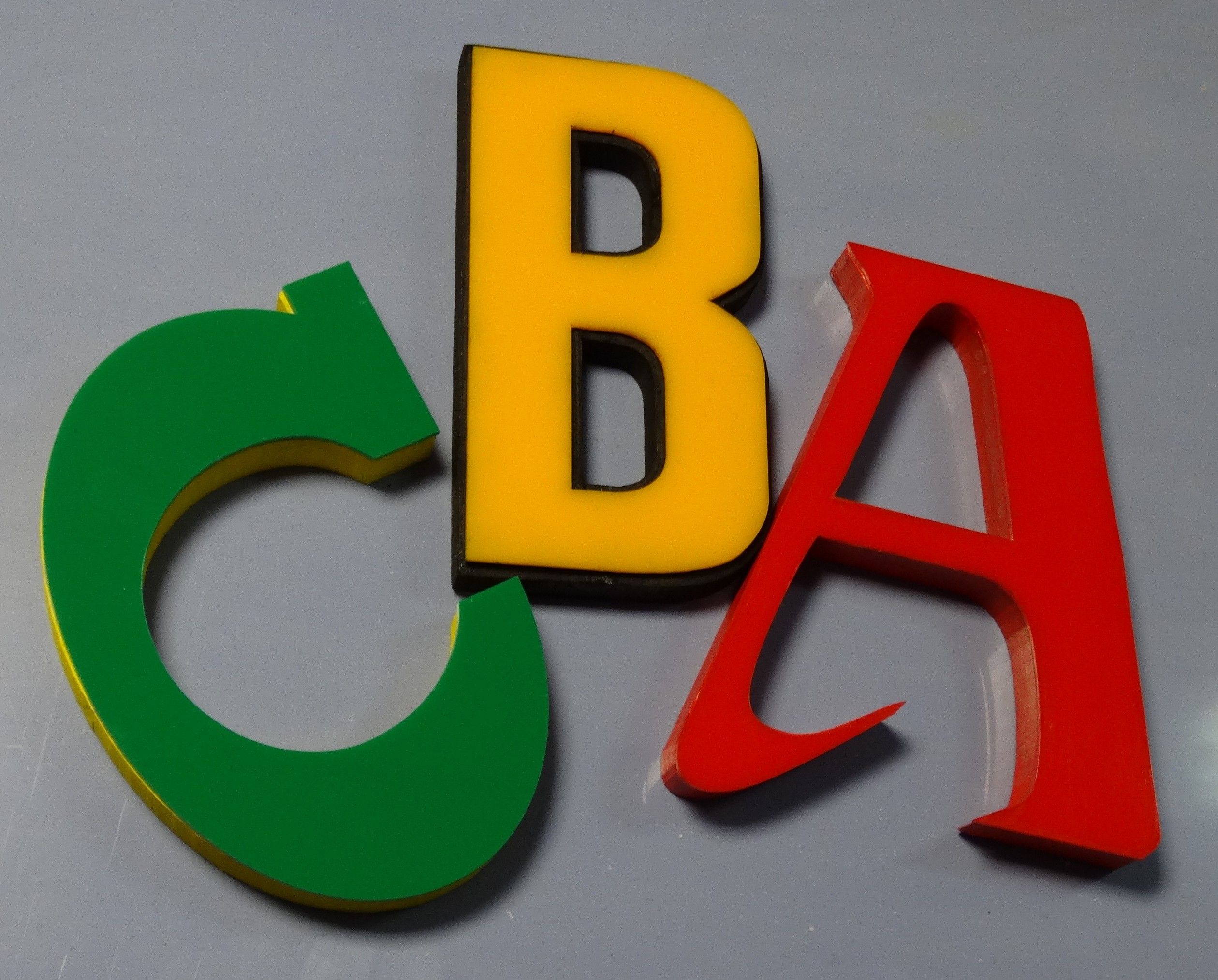Front litery wycinamy techniką laserową z pleksi a boki malujemy ręcznie farbami akrylowymi na dowolny kolor.