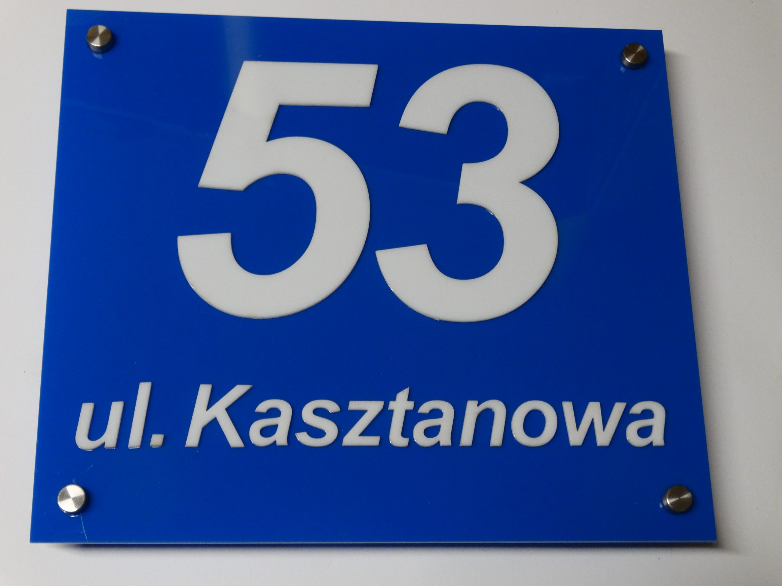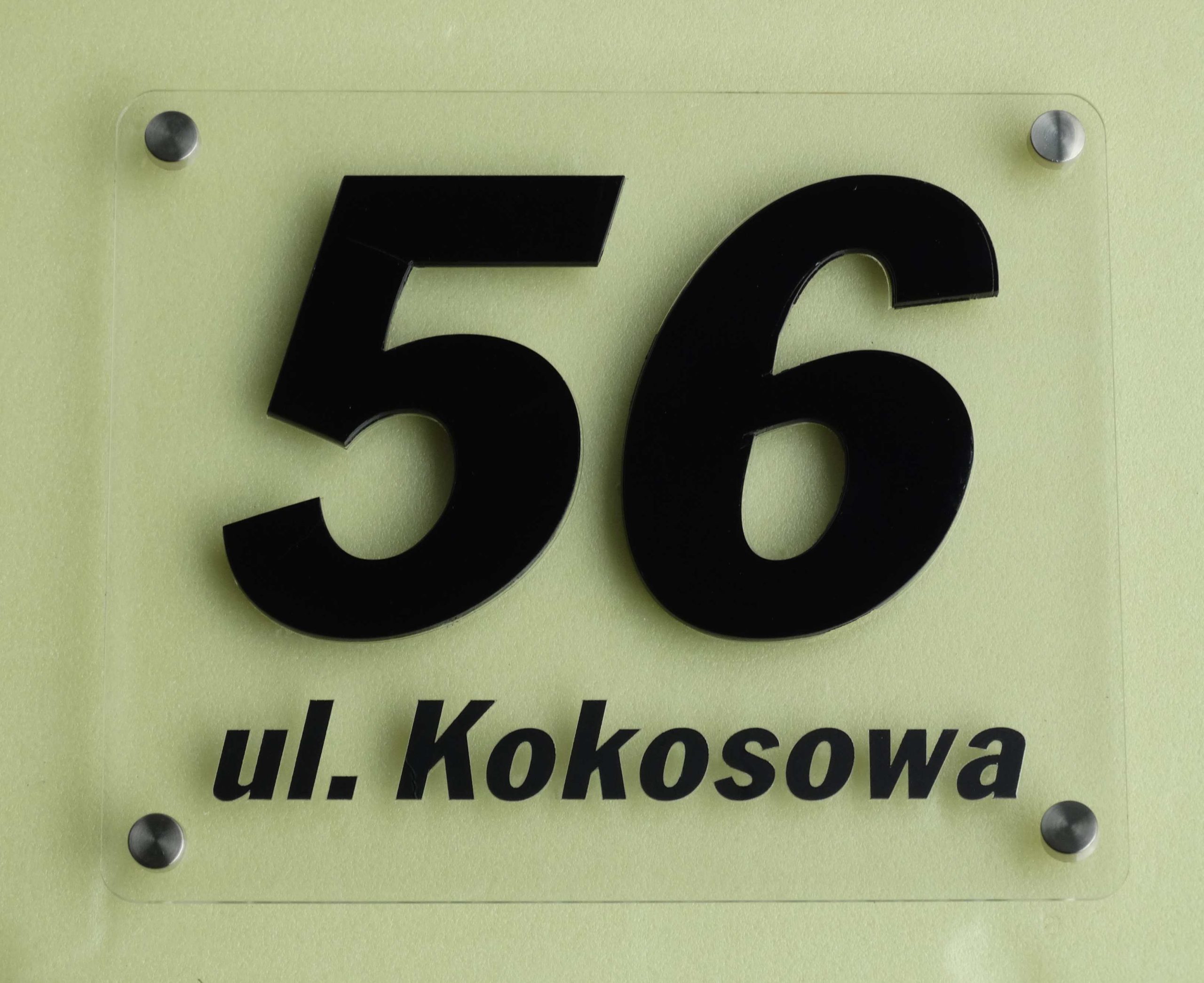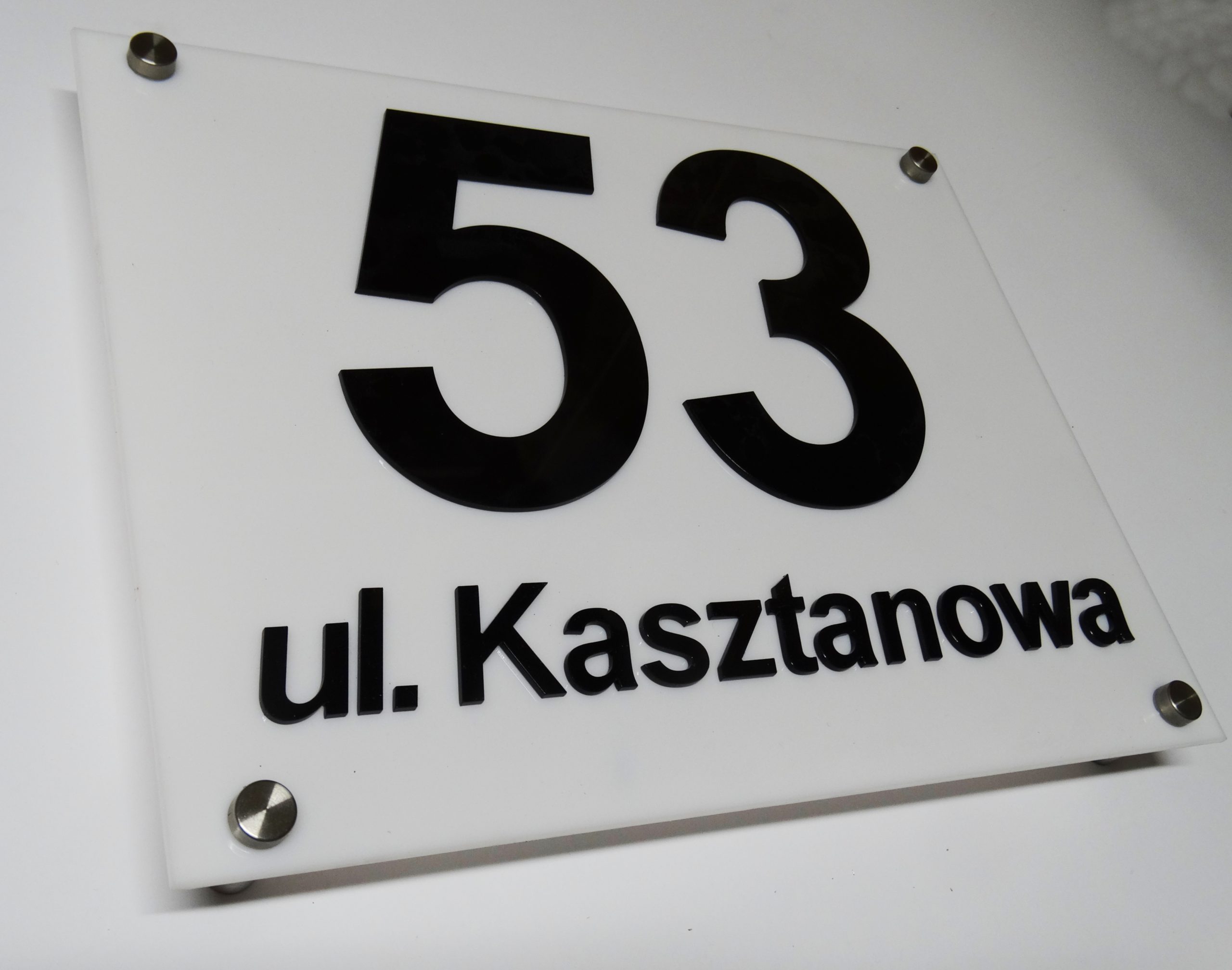 Numer posesji i nazwa ulicy standardowo wykonana jest z pleksi mlecznej lub czarnej. Do zamontowania tablicy dodajemy 4 ozdobne kołki dystansowe . Dzięki dystansom tabliczka uzyskuje efektownie prezentujący się na ścianie efekt 3d.